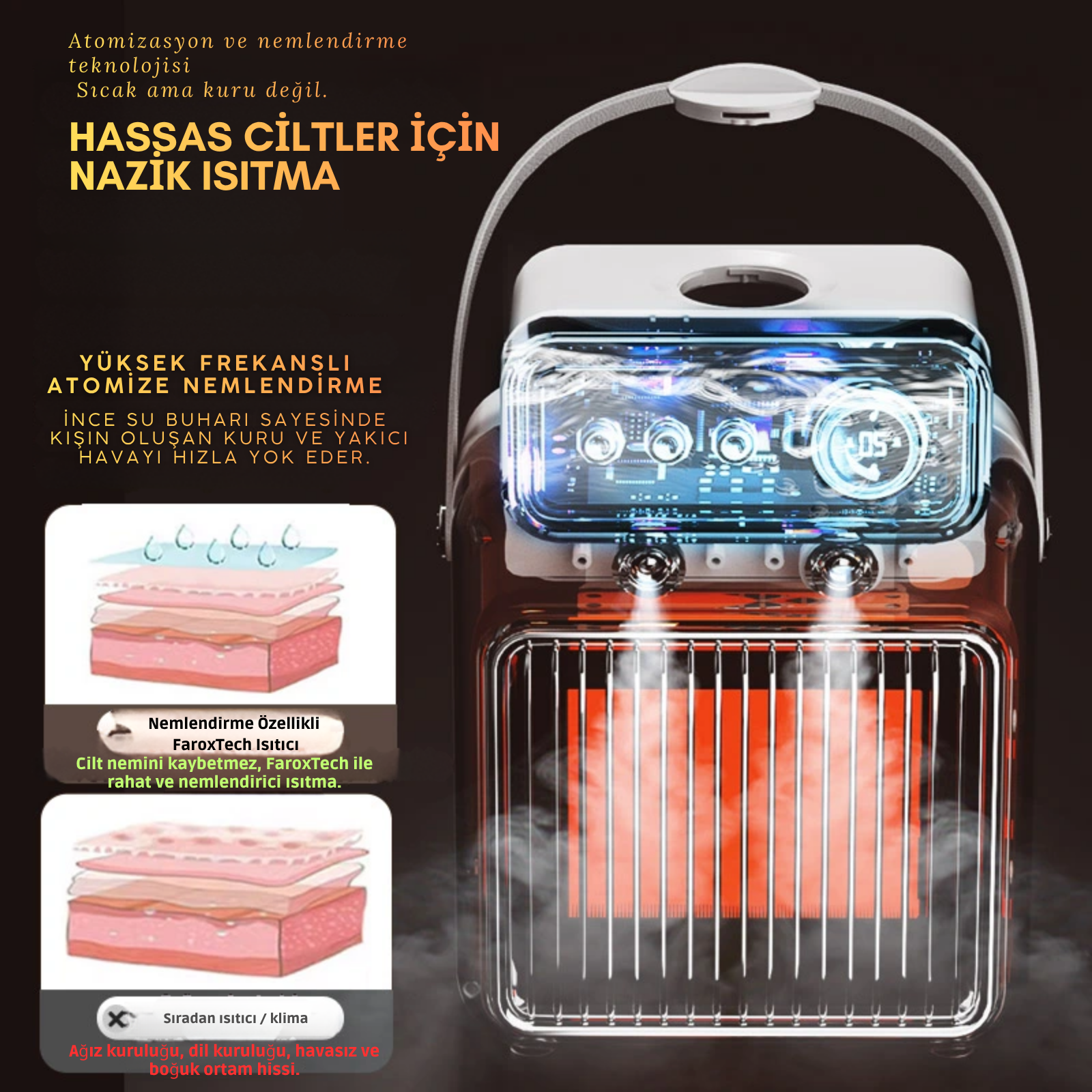 FaroxTech, kullanıcı sağlığını ve konforunu öncelik alarak geliştirdiği ürünlerle kış aylarında sıcaklığı daha yumuşak, daha dengeli ve daha sağlıklı hale getirir. Sıcak ama kurutmayan teknoloji!