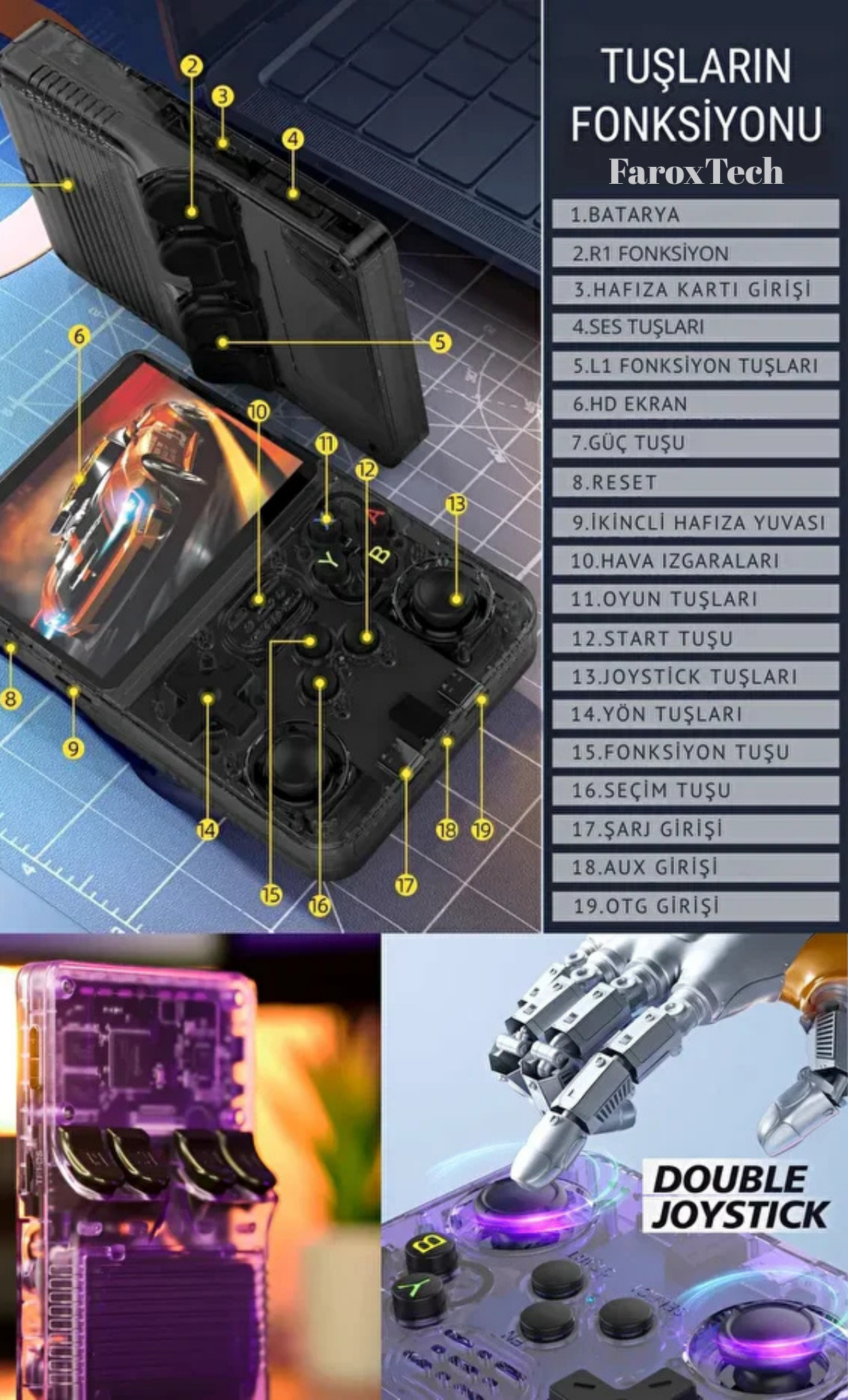 FaroxTech güvencesiyle R36S: Nostaljiyi cebinize sığdıran taşınabilir el konsolu. Çift joystick, 3.5” IPS tam ekran ve gelişmiş yazılım desteğiyle; atari salonu ruhunu her yerde yaşayın.